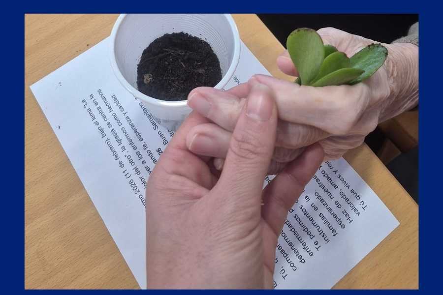Uno de los momentos más simbólicos fue la actividad titulada “Semillas de esperanza y fe", que sirvió para que cada persona residente palpara la tierra y sembrara con delicadeza una pequeña rama, estableciendo el paralelismo con el cuidado de una persona enferma. Se destacó que, al igual que la tierra necesita equilibrio, tiempo y paciencia para dar fruto, el acompañamiento al enfermo requiere dedicación serena, respeto por los ritmos y una entrega desinteresada, sin exigir ni esperar nada a cambio.